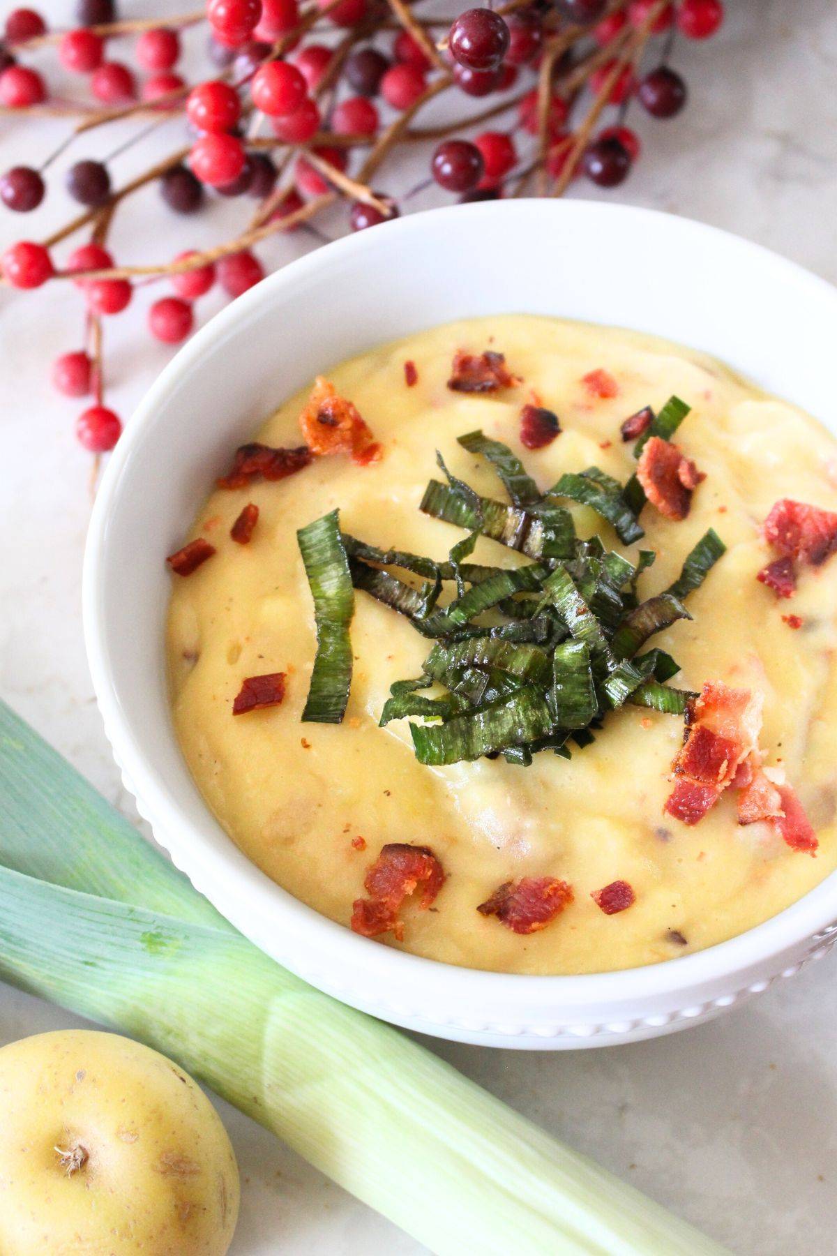 Thick and creamy, this classic Potato Leek Soup is full of the rich flavors of potatoes, leeks, bacon, and chicken stock. Blended to perfection, this dish is best served with a side of crusty bread topped with a thick layer of butter. While the weather is technically warming up here already (though, as I write this, it's actually pretty chilly), I'm doing all I can to cling to the cool-weather mentality. I'm not quite ready for temps in the 90's yet! So, in an effort to enjoy the last moments of winter (and really spring), I decided to share this classic potato leek soup recipe! Maybe you are in an area that stays cold/cool for longer. But either way, I hope you love this recipe as much as we do! Here are some of our favorite things about this potato leek soup: