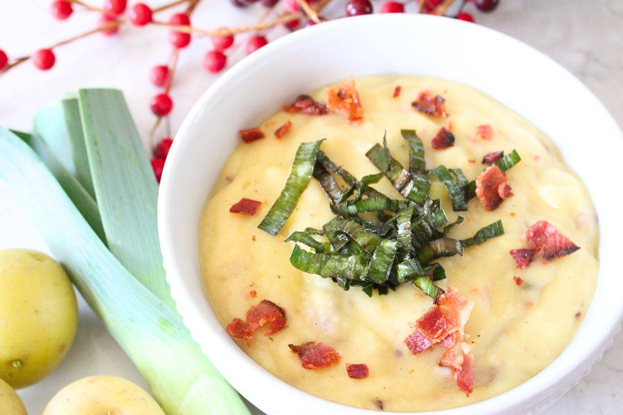 Thick and creamy, this classic Potato Leek Soup is full of the rich flavors of potatoes, leeks, bacon, and chicken stock. Blended to perfection, this dish is best served with a side of crusty bread topped with a thick layer of butter. While the weather is technically warming up here already (though, as I write this, it's actually pretty chilly), I'm doing all I can to cling to the cool-weather mentality. I'm not quite ready for temps in the 90's yet! So, in an effort to enjoy the last moments...